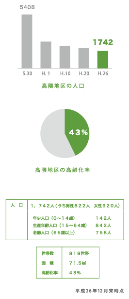 人口減少が進展した結果、少子高齢化が進み、現在の人口は約 1,700 人、高齢化率は約 43